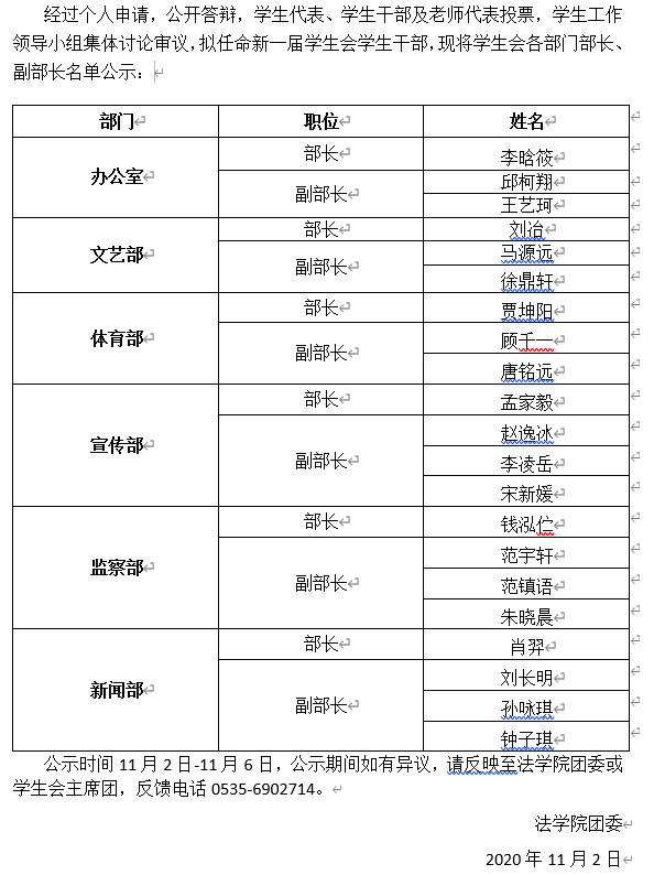2020年开云kaiyun官网学生会部长换届竞聘结果公示