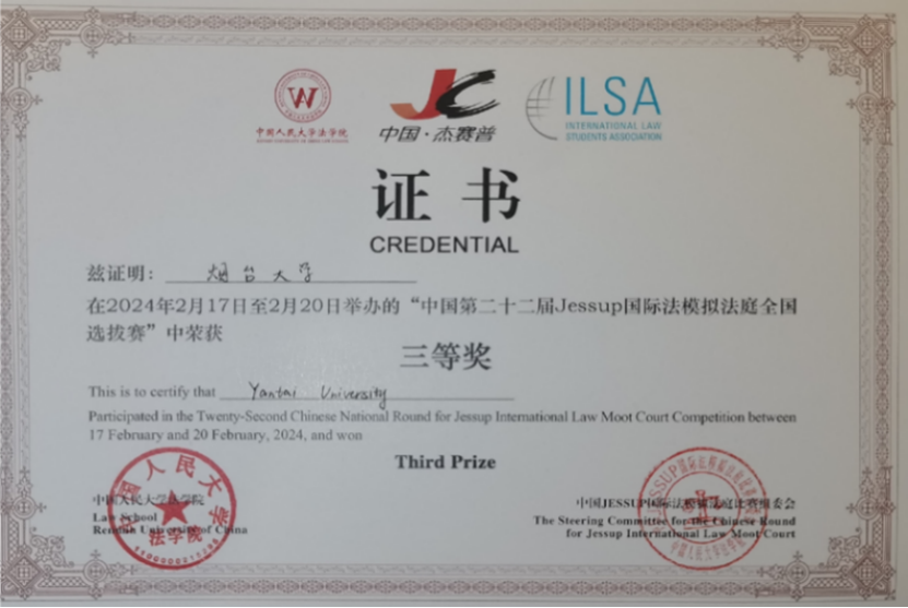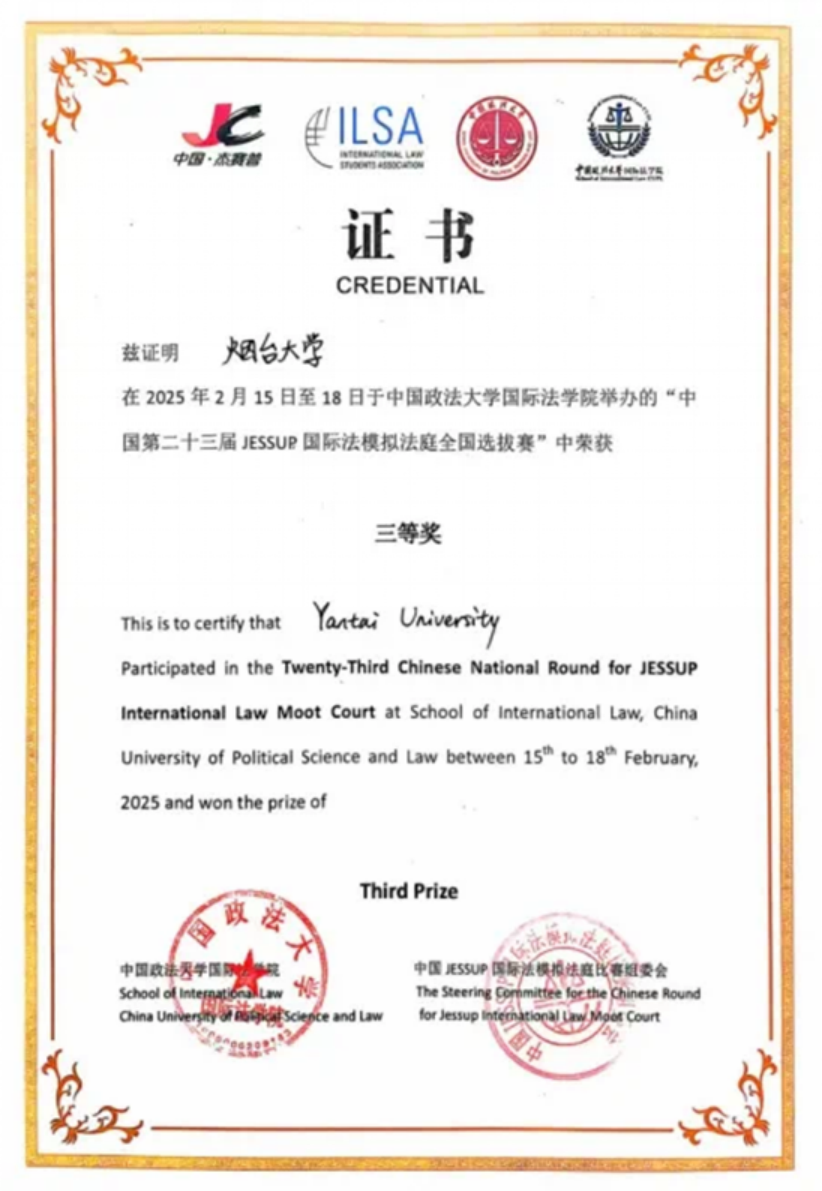Jessup开云kaiyun官网赛队由开云kaiyun官网朱玲玲老师、陆寰老师带队。2014年获得“杰赛普”国际法模拟法庭国际比赛二等奖;2015年获得“杰赛普”国际法模拟法庭国际比赛二等奖,队员获Best oralist;2021年获得“杰赛普”国际法模拟法庭国际比赛三等奖;2024年获得“杰赛普”国际法模拟法庭国际比赛三等奖;2025年获得“杰赛普”国际法模拟法庭国际比赛三等奖。